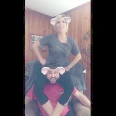 A man with a mouse filter holds a woman on his shoulders while he sits on a chair in the living room and then they lean too far back and both fall out of the chair. Snapchat.