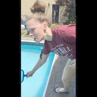 A teen girl helps a chipmunk out of a swimming pool and screams when it climbs up her arm.