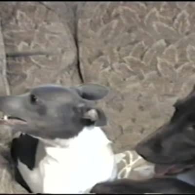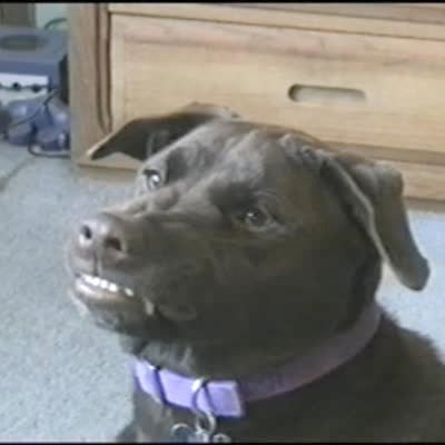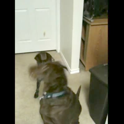 Small terrier dog barks & whines when chocolate lab dog barks in his ear.