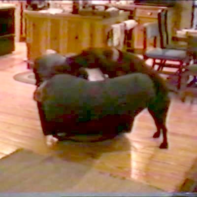 Dog jumps on woman sitting in recliner, pushes chair in circles and spins her while she screams. Silly pet trick.