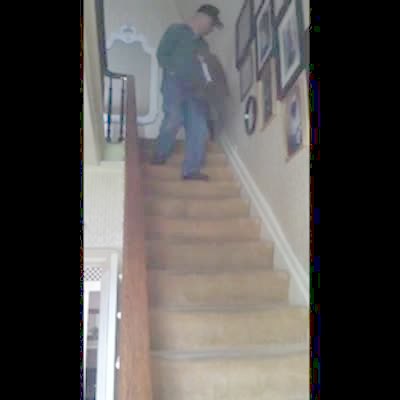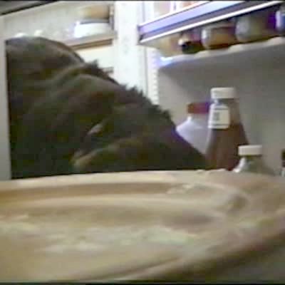 A man walks through his kitchen to find that his trash has been tossed all over the floor. He turns to a white pit bull dog and asks if she did it, then turns to a chocolate lab dog while she's stuck in a trash can lid and has her sit down, but she avoids looking at him and tries to get away.