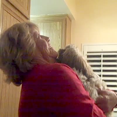 A small dog chokes on and spits out a piece of turkey. Action at :06.