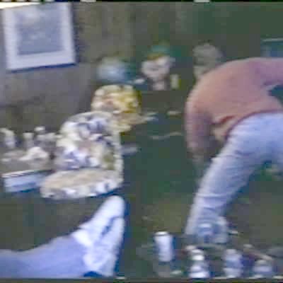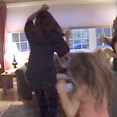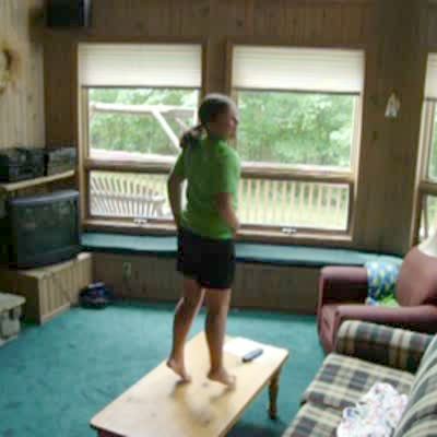 Teen boy dances on bar in the kitchen, he tries to jump to the opposite counter, he falls and hits microwave. Bonehead.
