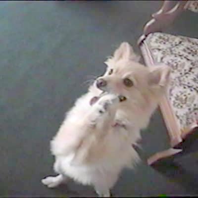 Dog moves its front legs and stands on his hind legs. Looks like he's dancing. Music in background: Fergie.