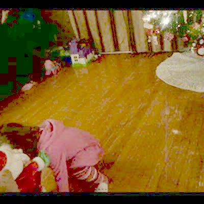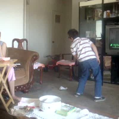 Tot boy falls out of his stroller in the background while sisters dance in the foreground in the living room.