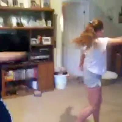 A teen girl tries to record a tap dance routine in the living room, but her dog runs in circles around her instead.