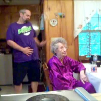 A man acts goofy in a kitchen and dances behind an unsuspecting older woman, amusing the woman behind the camera.