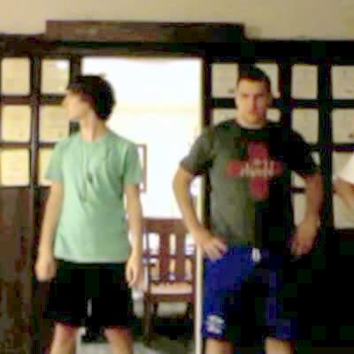 College men dance to Lady Gaga and one man falls hard off of another's shoulders. (2103)