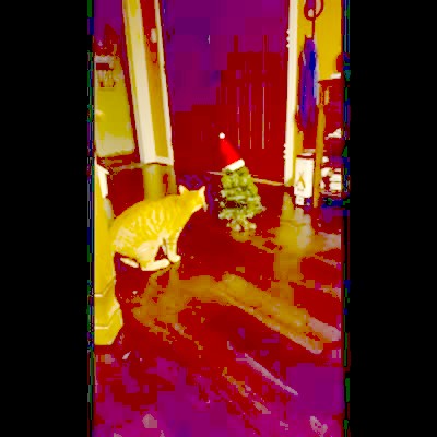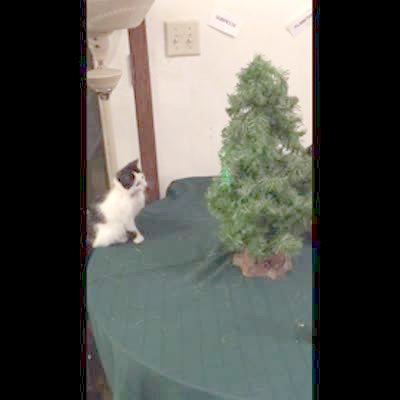 A cat sneaks up on a Christmas Tree toy indoors. The toy has a motion sensor that turns it on, so when the cat gets close, the face on the tree comes alive and it sings Christmas songs and the cat runs away scared. AA: Christmas