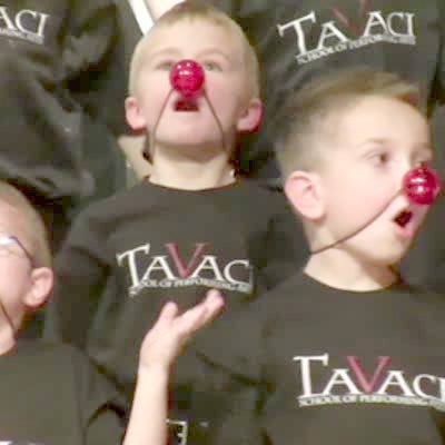 A group of children with blinking red noses on sing a Christmas song while making silly faces and crossing their eyes.