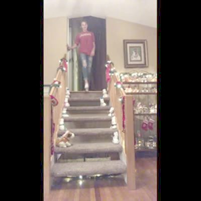 A teen girl tries to dance down a flight of stairs to the song Rockin Around the Christmas Tree and she slips and falls down the steps.