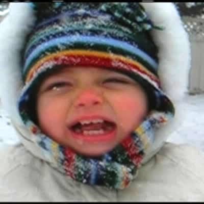 "Jingle Bell Babe" Tot girl out in snow sings Jingle Bells. Its windy and cold. Tot girl is not having fun. She starts crying.