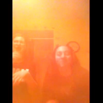 Two teenage girls try the cinnamon challenge indoors. One girl spits the cinnamon out, all over the camera. The room looks cloudy with cinnamon. The other girl pukes.
