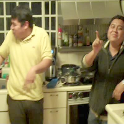 "The Spice Boys" Two men swallow spoonfuls of cinnamon in the kitchen and man in yellow shirt reacts with wild faces and a silly dance. Cinnamon challenge