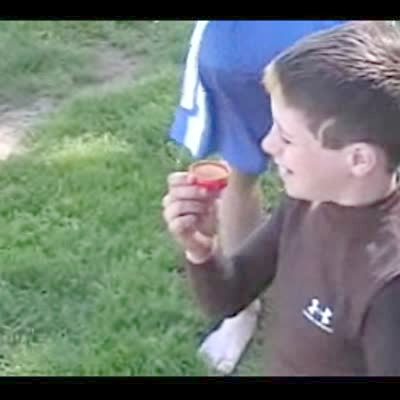 Boy is bet $50 bucks to eat a cap full of cinnamon. Boy puts it in his mouth and spits it out right away. Boy runs around with an ugly look on his face. It was gross. he drinks a soda.