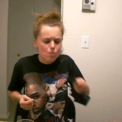 "Cinnamon Girl" Teen girl eats a spoonful of cinammon. Can't hold it in and spits it out in a cloud of dust. Also comes out her nose.