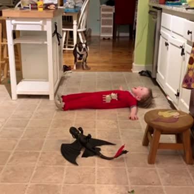 A tot boy falls in the kitchen and laughs when he loses his balance after he spins in circles with a dragon toy in his hands.