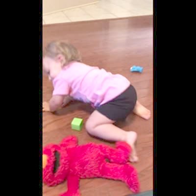 A tot boy picks ice cubes off the floor and puts them in a cup in his arms. Every time he bends down an ice cube falls out of the cup.