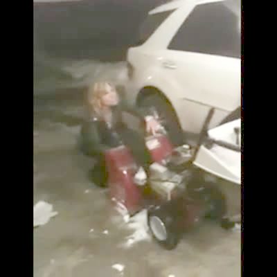 A woman uses her bundled-up young daughter in a winter jacket to clean off the snow on her vehicle in a snowy driveway. Security footage.