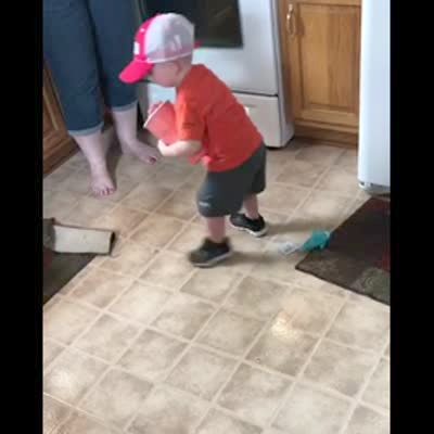 A tot boy points to a mess of cracked eggs on the kitchen floor and asks who will clean them up. The boy's mother asks who will clean the mess and he says she will.