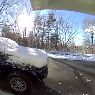 A man slips and falls as he wipes snow off of his truck in a driveway. Security footage.