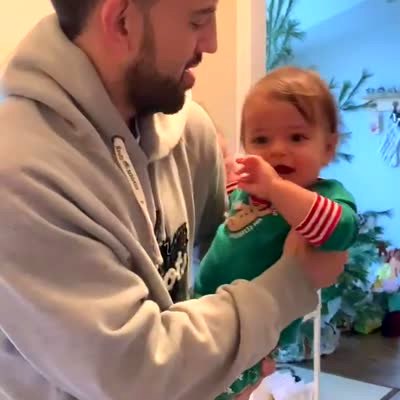 A man holds a baby boy. He says "do hand sanitizer." The baby wipes his hands back and forth.