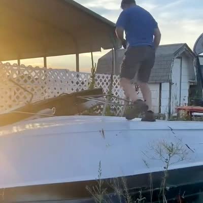 A man dances on top of a boat in a yard, then he jumps up to click his heels, and he slips and falls off of it.