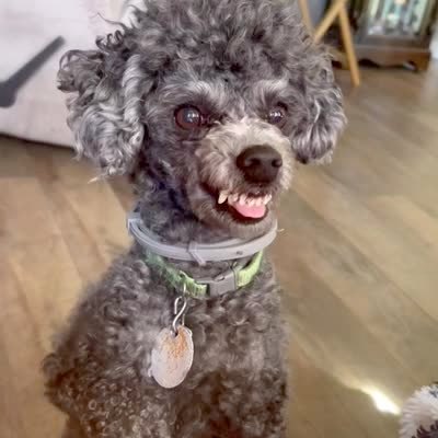 In a living room, a woman asks a dog if he wants a hair cut as he stands and snarls each time she says the word "clippers."