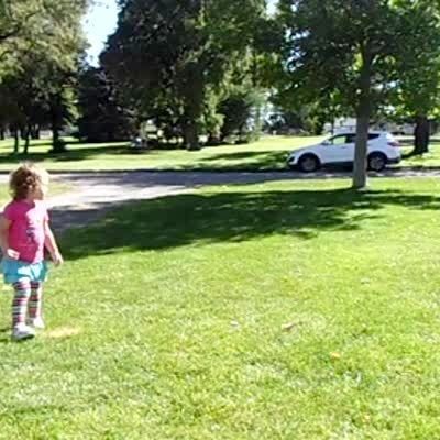 A young girl on sits in a golf cart and undoes the emergency brake so it rolls down the driveway. A man dressed as Captain America tells the daughter to get out and she does. The dad jumps into the golf cart and applies the brakes before it crashes into a parked car. The dad then says, "Good thing Captain America was here!" Security footage.