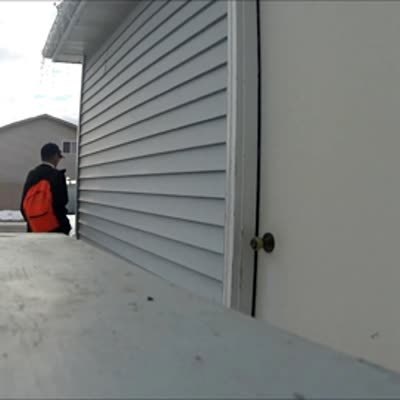 A man stands on a ladder in front of a house, then it slides down and falls on the porch steps and he lands on his feet. He whistles in relief. Security camera footage.