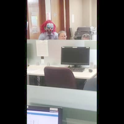 A man in a scary clown mask sneaks up on a woman in an office and stands behind her but she doesn't notice. When she turns around and sees him, she gets scared and screams.