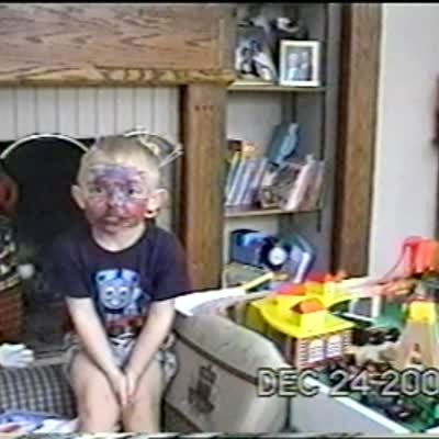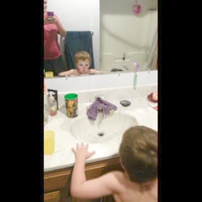 "Clown Face Flip Out" A young boy runs excitedly to look at his face paint in the mirror when he sees that it's a clown face and whines that he wanted a shark face.