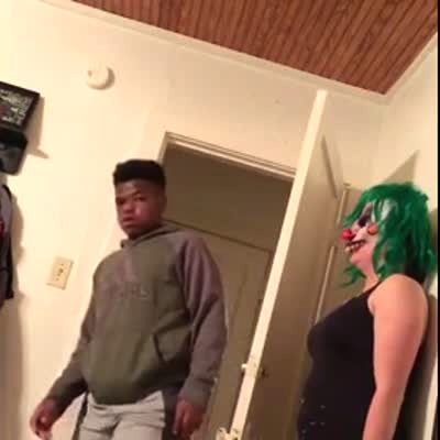 Young man walks into a room and is scared by another young man in a clown mask. Practical joke.