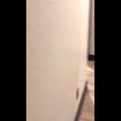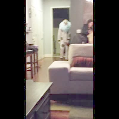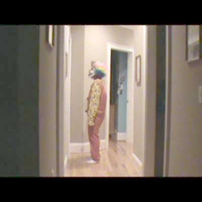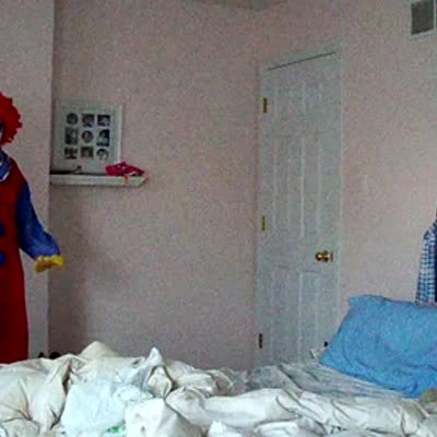 A young boy screams when he walks in to a bedroom and sees a woman in a clown mask behind the door.