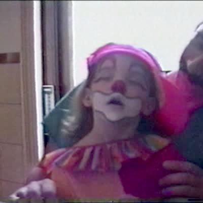 Halloween. Girl in clown costume falling asleep before going trick-or-treating. She keeps nodding yes when asked if she's ready to go out.