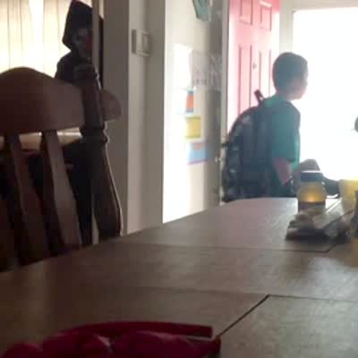 A woman with a clown mask on jumps out at a boy walking into the house from school, scaring him into tears, he laughs when he figure out it's his mom.