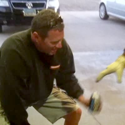 A man on his driveway sets up a half-clown-half-spider animatronic decoration. It screams and the man falls backwards as he startles.
