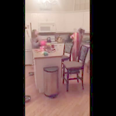 A man in a Pennywise the clown mask hides in the kitchen. A woman walking in the room is startles when she sees him and screams. She slips and falls as they both laugh.