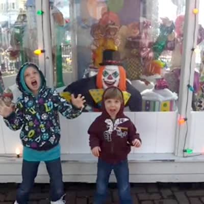 Two boys pretend to be scared and when the turn around and see a creepy clown behind them, they run off. At a carnival or someplace like that.