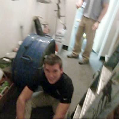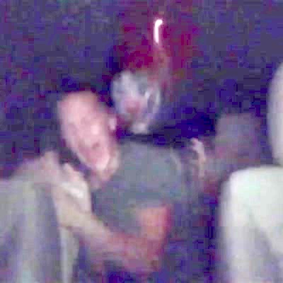 At 00:40:00 a man walks out of a room indoors when another man in a Krusty the Clown mask scares him with an air-horn and the man falls down.