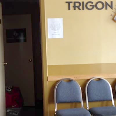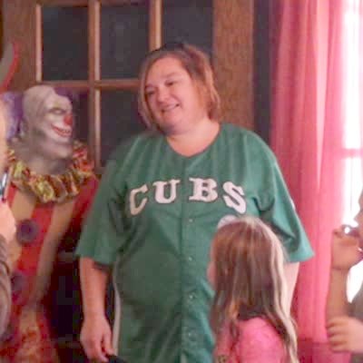 A family poses for a picture indoors as a scary clown sneaks up behind them. The kids turn away after the picture but the woman sees the clown and screams.