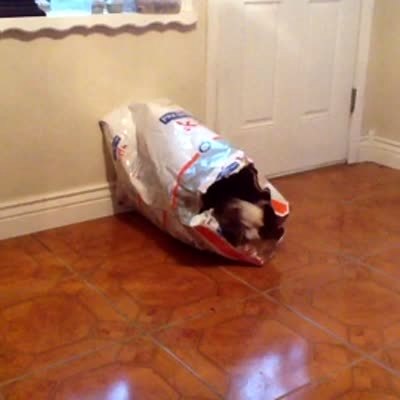 A woman asks "how many puppies can you fit in a dog food bag?" and ten puppy dogs and toy dogs crawl out of a large dog food bag attached to a wall.