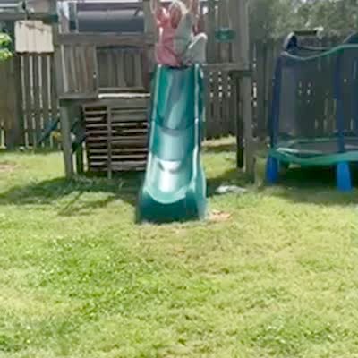A woman in a clown costume rides down a slide in the yard and it breaks and she falls off.