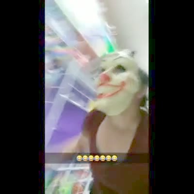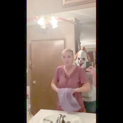 A woman washes her face in the bathroom and a man in a clown mask stands behind her. The woman screams and hits the camera.