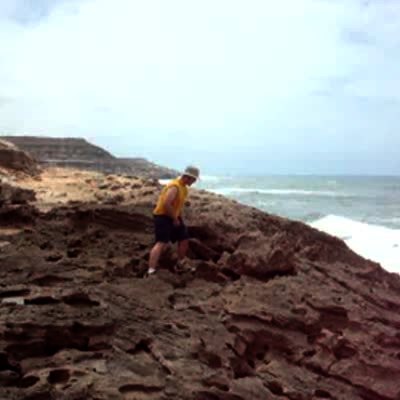 Two teen girls pose for a photo on the rocks at the beach. A wave then knocks over both of them.