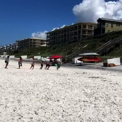 A group of men race young boys down the beach and one man crashes into a young girl.