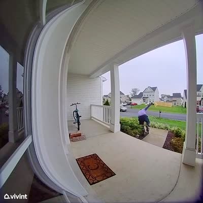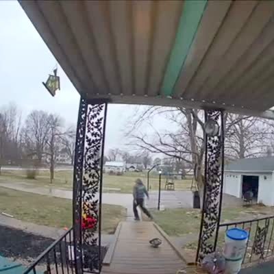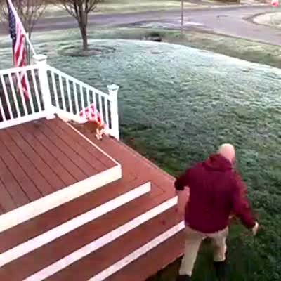 A man walks across a porch, stumbles spills coffee and falls into the bushes in the front yard. Security footage.