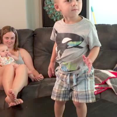 A young boy attempts to do a flip on a living room coffee table, when he topples over onto his side and says "dad was right." Music rights not cleared.