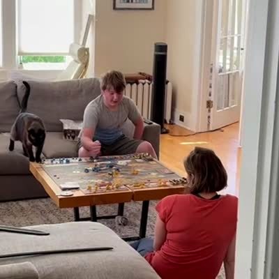 A young boy and a woman play a board game on a coffee table in a living room, and a man says that it took a while to set up the game. A cat walks across the table. The boy tries to push the cat away, but he knocks over the table and spills the game.