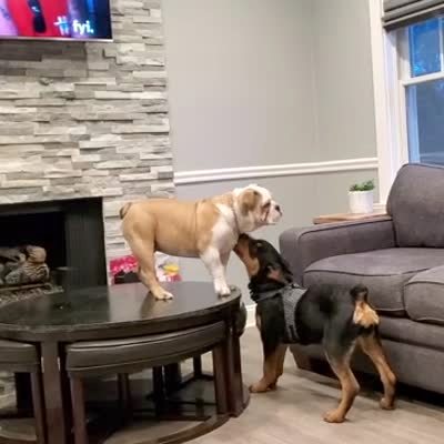 A Bulldog dog tries to jump from a coffee table to a couch but falls down on the floor in a living room.